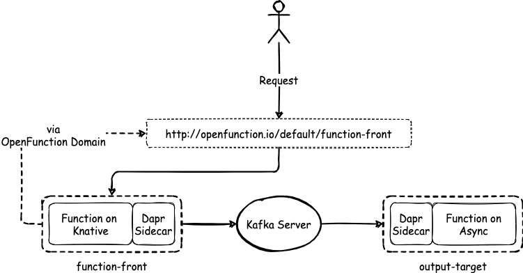 Similar to asynchronous functions, the functions that are based on Knative runtime can interact with middleware through Dapr components. This document uses two functions, function-front and kafka-input, for demonstration.